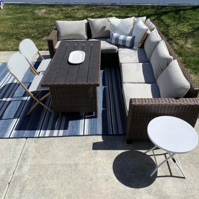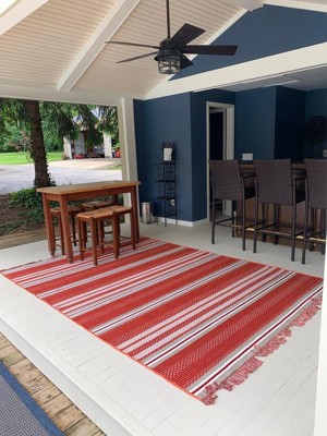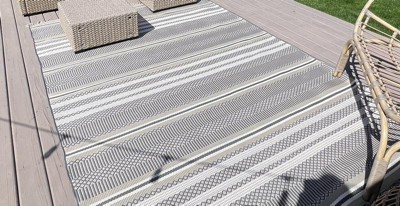 Bring a dash of urban style to your outdoor decor with this Global Stripe Outdoor Rug from Threshold™. The geometric global grid pattern on this outdoor rug fuses easily with most furniture tones and creates a warm and inviting atmosphere once furnished. You also don't have to worry about accidents or messes; you can easily clean it by just rinsing it with water.