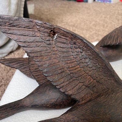 • •Detailed carved bird figurines depicting 3 various flight movements, metallic dark bronze finish throughout each bird wall decor sculpture