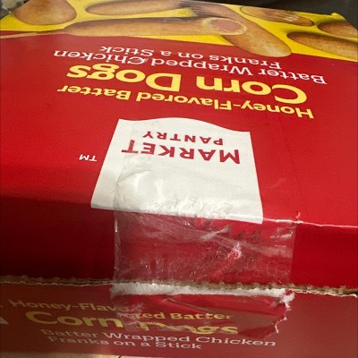 Box was opened and taped back. The corn dogs were inside one of those disposable fruit bags that you get when you are at the store. I saw another person posting a review and their product was EXACTLY as my box is. In the case this is the way market pantry delivers its products, then this company is not to be trusted with what were are going to eat.