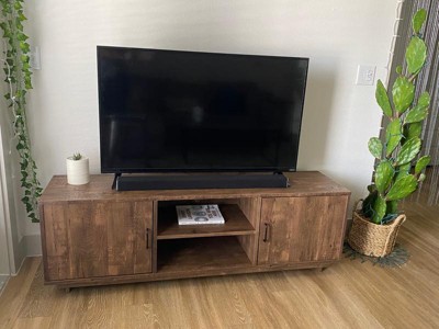Design your living space with variable, contrasting styles using the Homes: Inside + Out Fraire Farmhouse 60" TV Stand. A low profile conforms with trending styles for casual spaces. Its natural wood tone will create a nice visual boost and rustic upgrade when furnished with your media and electronic devices, while spacious storage compartments help organize and consolidate other media accessories. Make your media space more aesthetically pleasing with the charming Homes: Inside + Out Fraire Contemporary 60" TV Stand.
