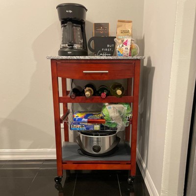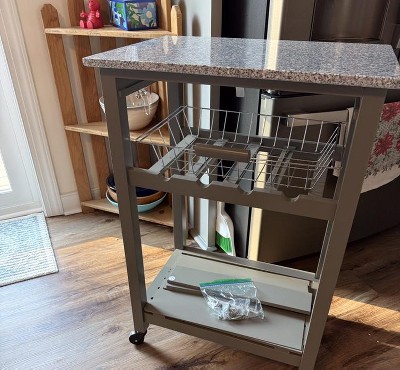 This kitchen cart is a versatile addition to any home, providing extra workspace and storage while enhancing the kitchen's aesthetic. Guests appreciate its stylish granite top and sturdy construction, making it ideal for meal prep, entertaining, or as a coffee station. The cart's wheels allow for easy mobility, and its thoughtful design includes a drawer and wire basket for organization. While assembly can be time-consuming, the end result is a functional and attractive piece that fits well in various spaces.