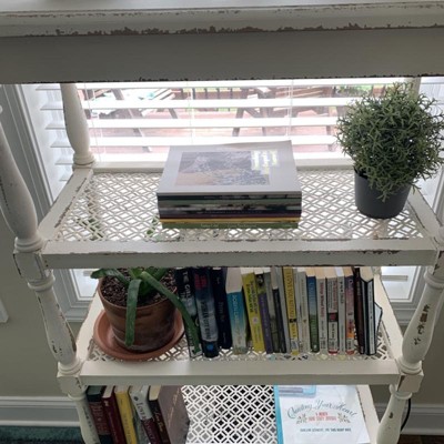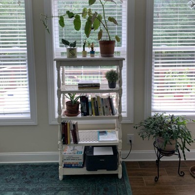Create a rustic display with this tall shelving unit with hardcover books, organic vases, large beaded garlands and potted plants. This item ships in 1 carton. Suitable for indoor use only. Some assembly required. Maximum weight limit is 30 lbs. This is a single white colored display shelf. Fir shelving unit features 5 shelves. Farmhouse style.