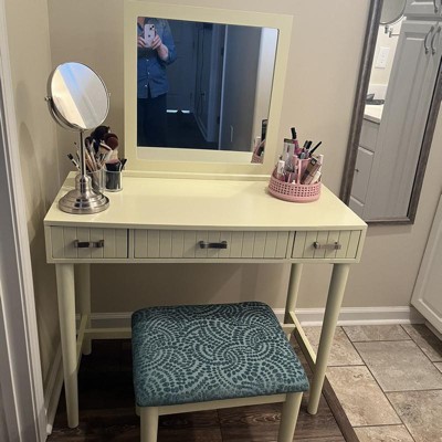 Add style and storage to your dressing area or bedroom with the Garbo Vanity Set. The vanity features a large stationary upright mirror and three spacious drawers for storing accessories and supplies. Straight lined silver drawer pulls, and vertical decorative carved lines accent the front of each drawer. The vanity is complimented by a padded, upholstered stool in a green swirl patterned fabric. Some assembly required.