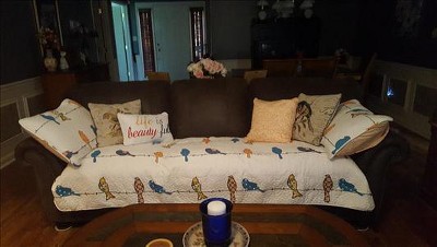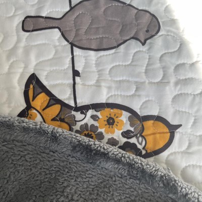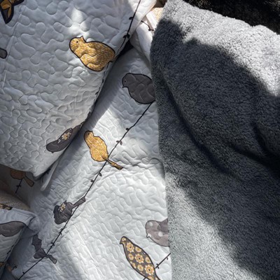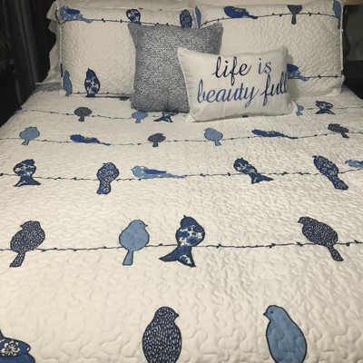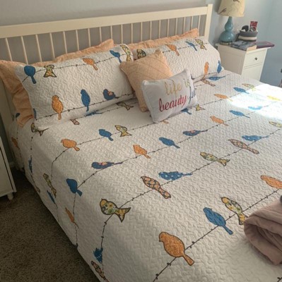 We love this cute light weight quilt. It is very light, perfect for warmer weather. We're putting a comforter under it for winter. It also is white and the birds are bright colors. Really helped brighten our bedroom, which doesn't get much natural light. We also appreciate the extra pillowcases and throw pillows.