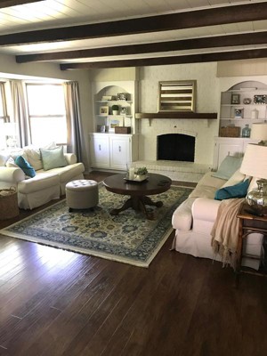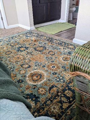 I'd been searching for an area rug for months and months. I looked at SO MANY rugs and suffer from rug-buying paralysis because of the risk of buying online. I decided to try this one because I could return it to the store if it didn't work. I bought the "beige" color, which is actually a lot of muted teal and blue. It's beautiful and looks high-end, and I love the fringe detail. As other reviewers have stated, the colors look less saturated in real life than the photos. But I'm happy about that because I prefer the colors to be a little more muted. It's a little more than I wanted to spend on a rug, but I'm very pleased with the purchase.