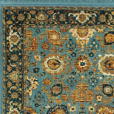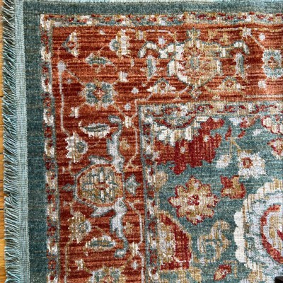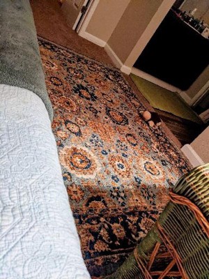I've purchased this style of carpet in the past, same brand, same color scheme and was very pleased with the quality and colors- although no 2 rugs were dyed the same. This latest version of the fringed area carpet is surprisingly ugly with a cheap looking execution of the design. the 'tourquoise' and salmon running through the navy is hideous and there's no hiding how cheap the weave is. I didn't even have to unwrap this rug to see how poorly executed this current incarnation of the Threshold blue fringed area rug is and couldn't return it fast enough