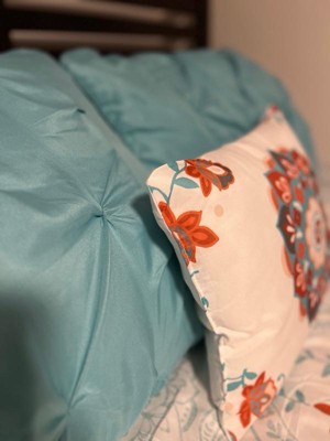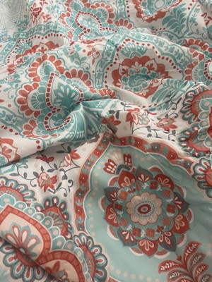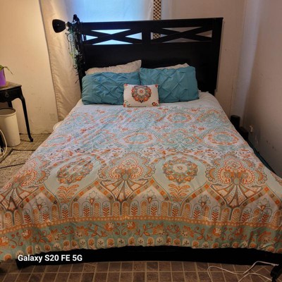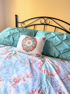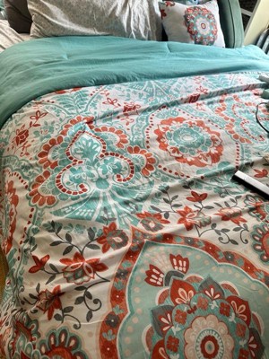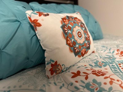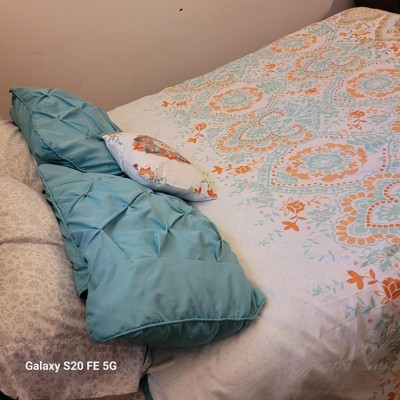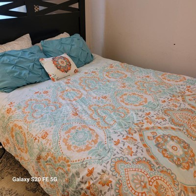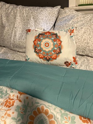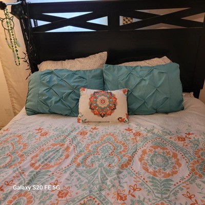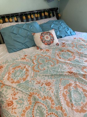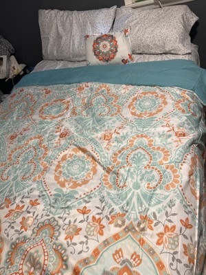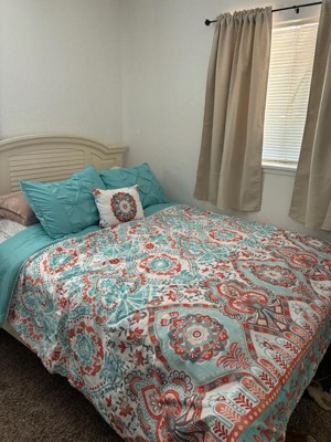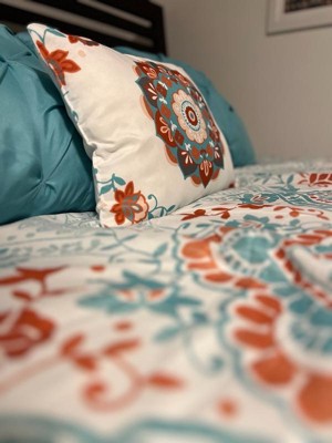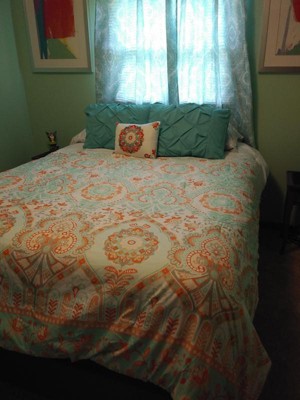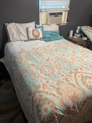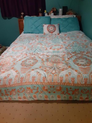 [This review was collected as part of a promotion.] I must admit I have a small bedroom so I have trouble admiring the comforter amongst all my stuff but the pictures don’t do this set justice. This is a gorgeous set. Does that comes with a fitted sheet, a flat sheet and comforter to pillow shams, and two pillowcases and an accent pillow. I didn’t have two shams, but I will be buying those soon. The fitted sheet fit my queen pillow top mattress very well. The sheets are very breathable, airy, and lightweight. This sat would be good for the spring and summer being as it is so light and airy. The color scheme of the orange and teal and white come together so perfectly. I also love the accent pillow it brings out all the colors.