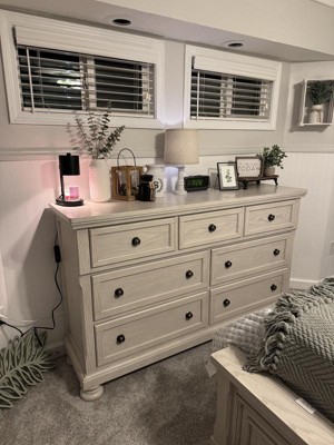 This dresser is a stylish and functional addition to any bedroom, offering ample storage with its seven spacious drawers. Guests appreciate its solid construction and elegant design, which complements various decor styles. While some have experienced issues with drawer alignment and color discrepancies, the overall quality and aesthetic appeal make it a worthwhile investment for enhancing bedroom organization and style.