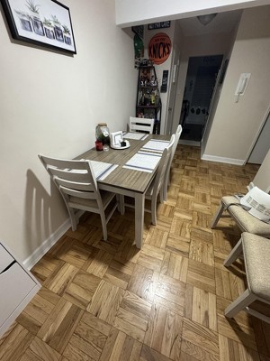 This dining set combines rustic charm with modern functionality, making it a perfect addition to any kitchen or dining area. Guests appreciate its sturdy construction, elegant design, and the bright grayish-white distressed finish that enhances the room's ambiance. While some have noted the firmness of the cushions and minor assembly issues, the overall satisfaction with the quality and aesthetic appeal makes it a worthwhile investment for creating memorable dining experiences.