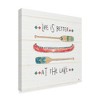 This ready to hang, gallery-wrapped art piece features the phrase "Life is better at the lake" around a canoe and colorful paddles. Giclee (jee-clay) is an advanced printmaking process for creating high quality fine art reproductions. The attainable excellence that Giclee printmaking affords makes the reproduction virtually indistinguishable from the original piece. The result is wide acceptance of Giclee by galleries, museums, and private collectors. Gallery wrap is a method of stretching an artist's canvas so that the canvas wraps around the sides and is secured a hidden, wooden frame. This method of stretching and preparing a canvas allows for a frameless presentation of the finished painting.