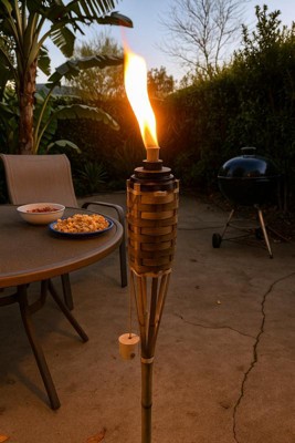 Natural flame outdoor torches help set the mood and add fun, decor and ambiance to your backyard or patio. Easy-to-use, weather resistant bamboo brings a longer-lasting bamboo torch and touch of relaxed style and flare to any outdoor space. These TIKI® Brand Weather Resistant Bamboo Torches are 6x more protective than non-treated TIKI Brand bamboo torches. They feature an island-inspired design crafted from all-natural, renewable, treated bamboo and stand 57 inches tall. Each TIKI® Brand Weather Resistant Bamboo Torch comes complete with a 12-ounce Easy Pour wide mouth canister with flameguard, long-lasting fiberglass wick and a snuffer to extinguish the flame when the evening is over. For proven mosquito repellency*, use with TIKI® Brand BiteFighter® Torch Fuel, and enjoy up to 5 hours of burn time with each 12-ounce fill. TIKI® Brand BiteFighter® Torch Fuel sold separately. *Based on studies using CO2-emitting mosquito traps which demonstrated over 50% reduction in captured mosquitoes compared to untreated controls. Use as directed. Efficacy may be affected by weather conditions, torch placement, and individual physical factors.