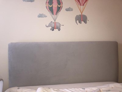 I have been looking for headboards forever. This is an incredible headboard that looks way more expensive than it is. It is a velvet fabric, light gray, very luxe. Queen bed shown, perfect size. The bed is actually quite raised but with the adjustable settings that was easily accommodated. I don’t think I could have gotten anything nicer even if I did it custom! Highly recommend.