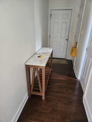 A: Hi Ndoyle, thank you for your questions! The top of this entry table is made of a durable laminate. The three color variations available are: Dark walnut top w/white oak bottom, rustic oak, and white faux marble top w/walnut bottom. Hope this information helps!