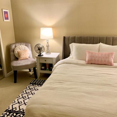 I agree the color is much different in person, more of a bright pink/coral not a blush and the white is true white. I actually love the way it looks with my white bedding and think it is very summery. I don't feel like the material is cheap, it's quite durable, but it is not something you'd want to sleep on probably. Also warning that you probably cannot return this. I tried and it would not allow me to return it at my local store at all even with the receipt. I got the lumbar size, but wanted to give a fair review and pic because I think it still looks really cute.