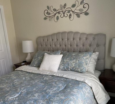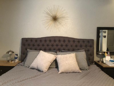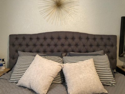 I really love this headboard. I chose to hang it as another review suggested because I put the king headboard on a cal king bed. I was worried it would be too wide or it wouldn’t be high enough to see once the pillows are placed. It totally works. And with all my pillows propped up it still shows plenty of headboard above it. Width wise I have a slight over hand on each side but because I hung it on the wall there are no awkward legs showing and no attaching to frame to deal with. I used a Hangman heavy duty mirror/ picture hanger. It looks so plush the tufting is deep like I had hoped and the grey is a dark grey which I wanted! More of a charcoal.