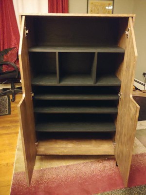 It’s a modern take on a shoe shelf that fits more than you’d expect. However, the reclaimed wood part is misleading because it’s not whole wood, it’s compressed and the wood pegs that you put in do not go in that far which makes you possibly puncture through the side doors when you apply them. This was very disappointing. For $237 I did expect some part of it to be solid reclaimed wood. And not a knock off version. Do not put together on your own. This thing is heavy! But it does look unique and cool in the entry way.