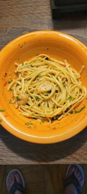 The taste of the sauce in Scott and John's shrimp scampi.