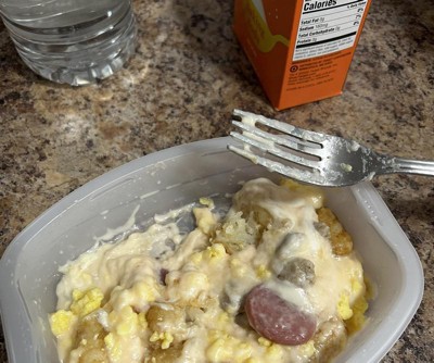 This was disappointing. Ahh you heat it up it doesn’t even look close to the box. It’s more like cheesy soup with egg pieces. The tater tots were good but this was a big mess. It was mushy and I didn’t see any bacon