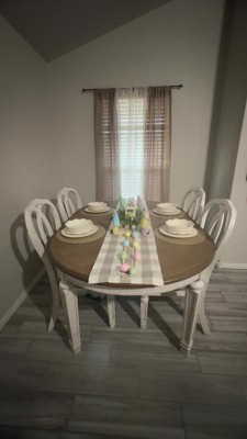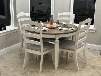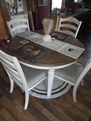 Bon appétite. This dining room extension table has all the right ingredients for a French country-inspired feast for the eyes. Drop-in leaf allows you to transform an intimate round dining table into a gracious oval dining table that comfortably seats six. Antiqued two-tone aesthetic pairs a chipped white with a distressed wood finished top for a double serving of charm. Signature Design by Ashley is a registered trademark of Ashley Furniture Industries, Inc.