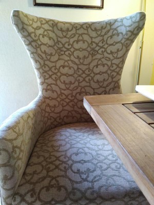 [This review was collected as part of a promotion.] These Angelica Arm Dining chairs are a beautiful set and addition to my living room. They come in a pretty, scroll-like pattern in a gold and tan pattern. It pairs very well with my teak dining table and living room decor. Installation of the legs was a very simple process as all the necessary tools and screws were included. It feels very well made and sturdy and is very comfortable and well cushioned. This is a step up from the regular teak chairs I have and look very elegant. The angled headrest is comfortable and lets you lay your head back a little after a nice meal. A really nice pair of chairs that are comfortable and stylish.
