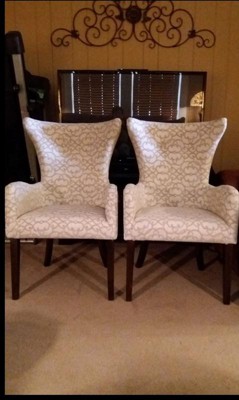 [This review was collected as part of a promotion.] When I removed the (set of 2) Angelica Arm Dining Chairs from the delivery box, I literally gasped! They are so beautiful! Each chair is upholstered in a lovely rich tan patterned fabric that creates a beautiful contrast to the dark brown solid wood chair legs (very easy leg assembly is required and tools are included) and I adore the Bronze nail-head trim. The chairs have a high back and round arms and a nice thick seat cushion which makes it very comfortable. I have the 2 chairs at each end of my dining room table and yet they look so luxurious that you can also move them around your home to use as accents chairs and/or Occasional Chairs when you have company and need extra seating. I'm proud to have these sophisticated chairs in my home and will use them for years to come
