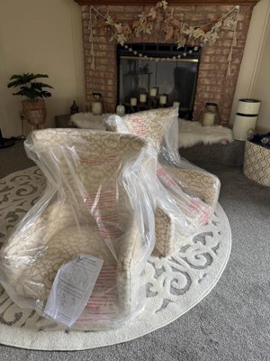 [This review was collected as part of a promotion.] My Angelica Arm Dining Chairs are beautiful . They are very elegant and sophisticated . The details and color of the print is beautiful. The studs detailing the border of this chair are the perfect color and compliment the color of the legs of the chairs . The assembly was very easy and took less than an hour from start to finish . They are a little hard but all new chairs are like that . Yes I would definitely recommend this chairs . The are beautifully designed and made .