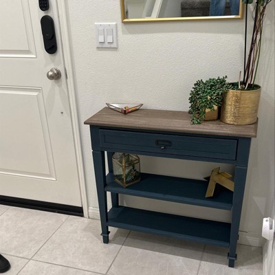 I’ve been looking for the perfect sized table for my entry and this one was on sale and the perfect height and width. It matches my artwork perfectly too and adds some color. Still trying to decorate it hehe. My ONLY complaint is that the drawer isn’t a smooth opening. It kinda just sits on a wooden “track” so it can open a little side to side if you don’t pull it smoothly. But the drawer isn’t used daily whatsoever so I don’t mind. The installation was super easy which I enjoyed!