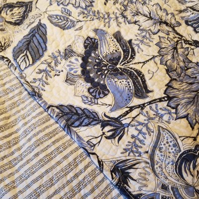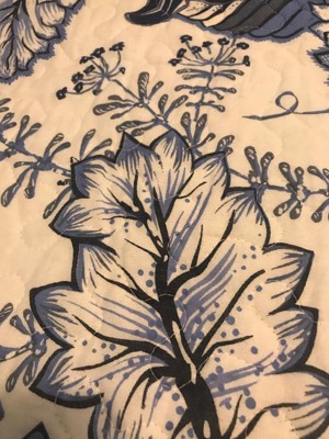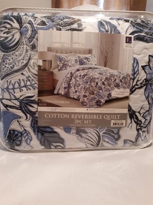[This review was collected as part of a promotion.] I love my new Cynthia Jacobean quilt and sham set! It is made from a very nice high quality soft cotton with a beautiful blue and white floral print on one side and a coordinating stripe on the other. I ordered the full/queen and it lays nicely with plenty of coverage down each side on my queen size bed. It is machine washable and tumble dry. I am very pleased!