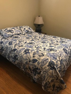 [This review was collected as part of a promotion.] I received this Cynthia Jacobean 3 piece reversible cotton comforter set. It's an absolute beautiful soft comfortable lightweight comforter the colors are beautiful Supple Blues. The comforter and lightweight I love that it's double-sided cotton comforter the one side has stripes going down comforter the other side has like a nice Leaf design and I love the blue colors that are in it. The stitching on it is perfect. It is a very beautiful well made material and it makes the bedding absolutely gorgeous and I love it. I showed this three-piece bedding to my friend and she loves it and she's getting something similar for her bedding. Thank you for this amazing opportunity. #Tryit