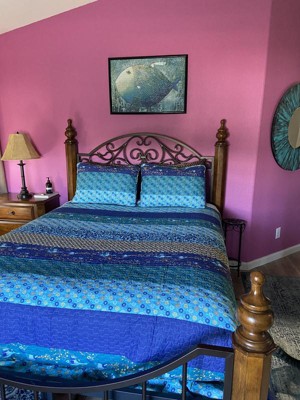 3pc Full/Queen Royal Empire Quilt & Sham Set Blue - Lush Décor: Bohemian Floral Reversible Bedding, Lightweight Cotton