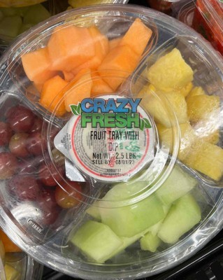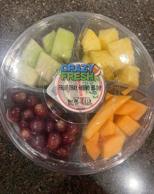 Crazy Fresh Round Fruit Tray 2.5lb. Fruit trays are a party staple, but we don't always have time to prepare. With a Crazy Fresh Round Fruit Tray, we've done the cutting for you - fresh and precise! And what's better? We've added a creamy fruit dip for extra convenience and dipping fun. It's also the perfect grab and go snack for the fruit lover in your group.