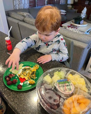 The crazy fresh fruit tray was an easy and quick option to put out with breakfast when we were at a family members house. It's 2.5 pounds of fresh fruit, honeydew, antelope, pineapple and grapes. The fruit was juicy and tasty and I love the dip it comes with. I received an incentive to write this review.