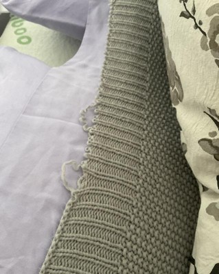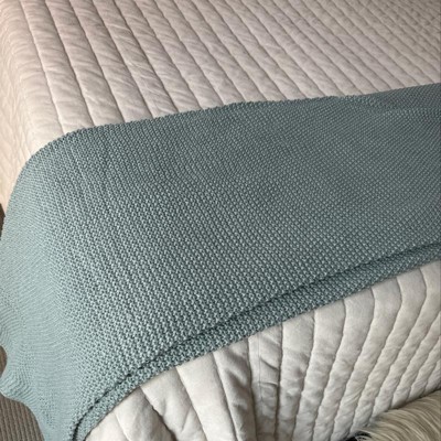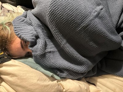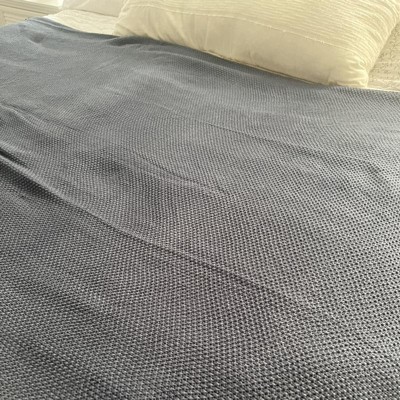 [This review was collected as part of a promotion.] The lighting in the photos makes this blanket look like it’s more of a grey color, but it is a pretty -dusty- blue in my opinion. After washing this blanket, it was SOO soft. I’m always a bit weary of getting knitted blankets because sometimes they can be a bit scratchy, but before and after washing, it’s very obvious that it is soft and plushy. This is a twin size, but it actually fits across my king sized bed. It doesn’t come all the way up to the pillows but that’s ok since it’s more for looks on the bed rather than for warmth. I intend of using this blanket in the spring when it’s still cool outside and I need something to snuggle up with on the couch. It’s a perfect “throw” (I don’t usually buy throws since they’re too short - twin size is the way to go).