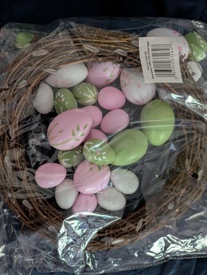 The item was shipped in a flimsy plastic bag, so when I received it not one of the eggs was attached to the wreath. Returned. Such a pity because the colors really make it a beautiful addition to any decor.
