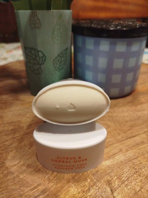 [This review was collected as part of a promotion.] Smooth, solid texture that glides in easily with a fresh citrus land herbal musk scent. Feels light, non-greasy, and provides reliable odor control.
