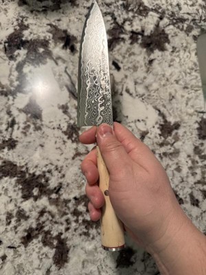 [This review was collected as part of a promotion.] One of my good friends in high school bought me this knife for me as a graduation present, since I want to pursue culinary as a career. I’ve been using this knife constantly at work, the knife is still very sharp (as long as you hone it properly). When I first picked up the knife I noticed the more d shaped handle and being a lefty I was a bit concerned about how it was going to feel in my hand, but to my surprise the knife fit very well and has been comfortable for me. Another thing I noticed when I first held the knife was that the knife didn’t have any lacquer finish, which I was used to from other knives. After using it at work I’ve come to love the fact that you get a more textured handle, it helps me grip and hold the knife better, where as the lacquered handles tended to slip at bit more. I would definitely recommend this knife to anyone who loves to cook and be in the kitchen wether they work in a professional kitchen or not.