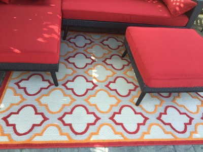 Beautiful vibrant carpet - great quality and nice for walking on in bare feet as we have it outside. The first day our dog dug in the dirt after swimming and left black foot prints all over it. Easily wiped up and easy to care for