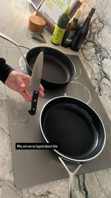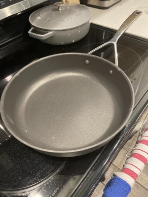 This 9.5 in high-sided non-stick pan is great. It has a high-quality feel and the weight is very easy to manage. It performs beautifully on my induction range. I was a little concerned that the design of the bottom might cause scratching of the glass cooktop but it doesn't seem to. This is a great product for the stovetop and oven.