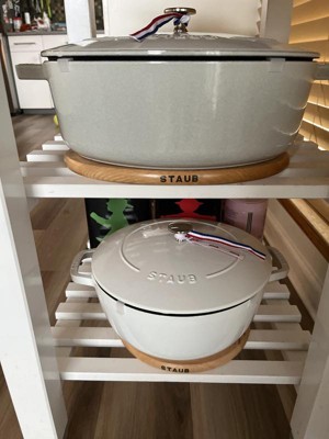 Perfect for mini cocottes as well as the larger pots. I have one on my table with several mini cocottes filled with salt and spices. The pots do not move from this magnetic trivet. they are a necessary accessory for your pots. Protect your table,protect your pot! the natural wood does not clash with the beauty of the Staub cocottes.