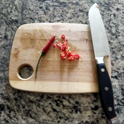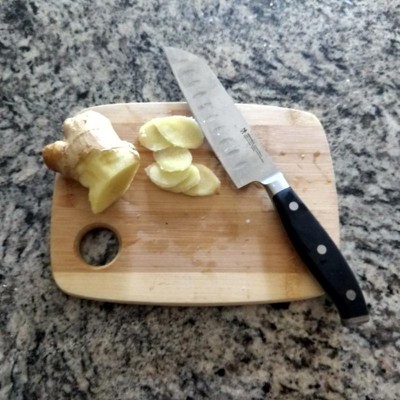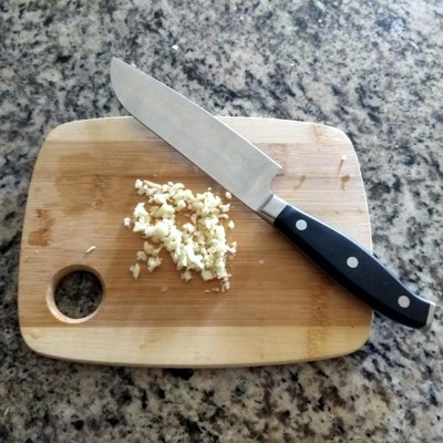 [This review was collected as part of a promotion.] I was eyeing this santoku knife for a while. It has a narrower blade than traditional santoku knives. I own several other santoku knives and was very curious about this one. Upon opening it come out razor sharp with a good feel of springy, forged steel. Blade is not very thick and its width makes it very versatile for slicing and mincing small vegetables, herbs, garlic, etc. A separate prize goes to the handle, it is very ergonomic and allows to work with the knife with a great control. However, I got a bit perplexed by the fact that the hollow edge is only on one, left (sic) side, which I found quite counterintuitive.