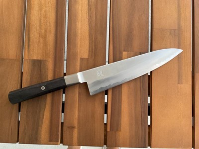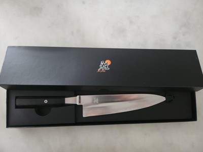 Beautiful chefs knife I received as a gift and so far loving it. Cuts so smoothly and has a lovely edged handle for better grip. Steel is a bit sensitive to water marks so just have to be careful to wash and dry right after using it. Other than that, love it!