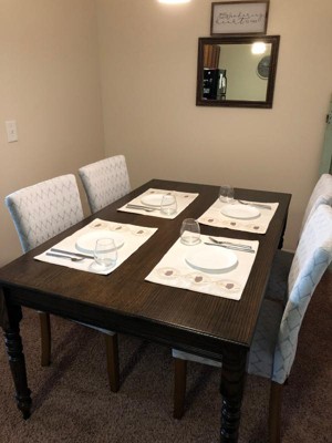 These chairs are a very nice print and easy to put together. However, the wood on the back of these chairs is very flimsy. My husband who is not a big guy, leaned back and broke 2 of these chairs!!! The wood is like a partical board. If you don't use them and only have them for show, then they are great. Otherwise, forget it.