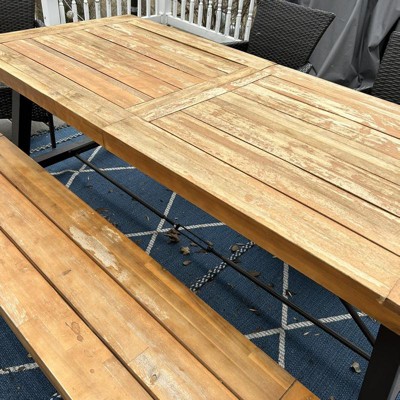 We bought this table for our outdoor patio. The seat cushions are white, which does not seem the best choice for an outdoor table. However, the fabric is also badly suited to outdoors. We have some night time insects here that settle on the cushions, then some of them die. When I tried to wipe the dead insects away, they left black smears on the cushions. We tried cleaning the cushions with multi-surface cleaner, but we could not get them clean. We had bought some bolster cushions (separately), and they did not have any issues with bug smears. We were disappointed that the wooden surface of the table and bench were rough and poorly sealed. After about four months outdoors (some of the time covered), the wood was even rougher. Those same insects settled on the surface, and in some cases they seemed to become black spots absorbed into the upper surface of the wood. We decided to sand the table and bench and then reseal it. We could not sand out the black spots without removing a significant of wood, so we left them. After a light sanding, so much of the table’s color was gone (it was not well stained and the stain was very superficially absorbed), that we decided to also re-stain. After sanding, staining, and sealing, the table looks very nice, much better than when we purchased it. The table, itself, is solid and sturdy. The wood seems to be good quality; however it is not remotely prepared for outdoors. It is not even prepared for indoors. The staining/sealing were done very badly. After sanding/staining/sealing and buying all new seat cushions, the table looks very nice. But you should be prepared to invest time and expense, following the initial purchase, if you want a nice table and chairs. I am including a few photos of the seat cushions, although they were hard to get into focus.