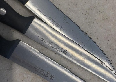 [This review was collected as part of a promotion.] I loved the edge the blades had. Some of the steak knives had discoloration on the black of the handles but oh well. Blades have great weight to them and the cut is very clean