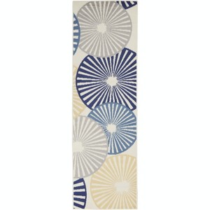 An array of overlapping orbs create captivating energy and vibrance in this Grafix runner rug. Radiating circular patterns in soft blue, white, and beige adorn a subtle ivory field in a burst of contemporary flair.