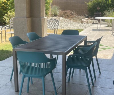 MODERN DESIGN: With clean, precise lines, our dining table is the ideal modern accessory for your outdoor space. Finished with sleek faux wood slats and smooth aluminum frames, this table not only offers a chic, minimalistic look but also provides incredible structure.