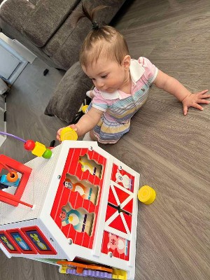 This is well designed to appeal to a wide age range and to require different levels of skill. If you only get one toy, this could be it. It has many well thought out features that allow it to be used at different skill levels, and can be used from a sitting or standing position. All the pieces go inside so that they don't get lost or need another container. Our 11month old grandson could use some features immediately like the tractor on the side, the moving butterflies, and the snapping and sliding doors. He then learned to manipulate the birdy on the wire, and drop the hay bales into to right slot. next he learned the little lever to release the bales. We are working on dropping the animals into the barn.
