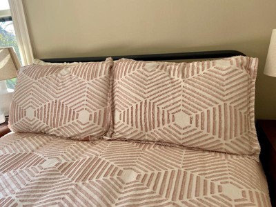 Thank you for sharing your thoughts on our duvet cover set! We’re delighted to hear that the woven texture didn’t pose an issue for you and your husband, and that it adds such a beautiful touch to your space. It’s wonderful that the duvet cover and pillowcases fit your queen duvet perfectly! Crafted from soft, breathable cotton, this duvet cover set features a stunning geometric design in a blush clipped jacquard, complemented by a solid blush reverse. The cotton fabric provides a cozy, natural feel, while the texture of the jacquard adds dimension and visual interest. While the fabric may feel slightly firmer when new, this is typical of cotton and jacquard materials. It will soften with use and washing, offering a more comfortable and cozy feel over time. The 88"W x 92"L size fits a queen duvet beautifully, and the button closures and corner ties help keep your insert in place, ensuring a snug and secure fit. We believe this duvet cover set offers great value, considering its unique jacquard design and the quality of the cotton. It’s made with durable, high-quality cotton that ensures a comfortable and breathable experience. We aim to provide a balance of quality and affordability, offering a beautiful, long-lasting duvet cover set at an accessible price. We appreciate your honest feedback and hope the set continues to add a touch of elegance and charm to your bedroom! If you have any further questions or need assistance, feel free to reach out—we're happy to help!