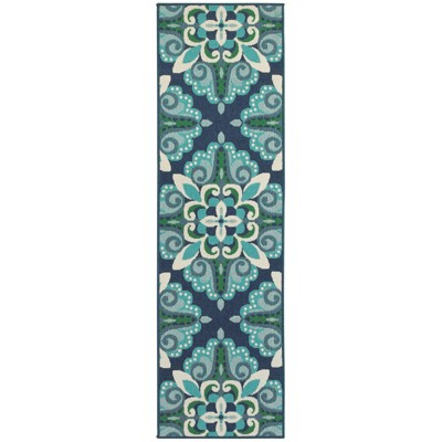 This Marlowe Medallion Patio Rug brings an elegant update to your living area. Showcasing a motif of floral-inspired medallions in hues of blue and green against a navy backdrop, this printed patio rug adds a dash of color to your living area. This blue and green rug features a low-pile design made from fade-, weather- and stain-resistant fabric for long-term use, and it can easily be placed anywhere from your patio to your entryway hallway for versatile style. Great for high-traffic areas, this woven patio rug makes a seamless addition to your decor.