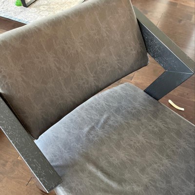Features an adjustable spin back and plush seat upholstered in dark charcoal gray faux leather